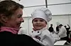 Den lille jenta i kokkelue som heier på pappa heter Amalie Arvesen og er to år. Her sammen med mamma Solveig Edvardsen.