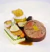 * Servert med artisjokk, sago og østers kompott, grønnsaker.