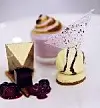 * Varm solbær soufflè, sprø feuilletine, marmorert yoghurt og solbæris.