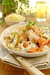 Pasta kan kombineres med svært mange andre råvarer, og det er ingenting i veien for å blande sjømat og kylling i samme pastarett.