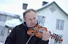 Knut Fausko med fela utenfor Fausko Skysstasjon