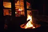 Bål på terrassen med oppholdsrommet i hytta i bakgrunnen. (Foto: Heidi Fjelland)