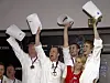 Geir Skeie (til høyre) vinner Bocuse d`Or. Nærmest Skeie hans forloved Katrine Borg Larsen, som blir vertinne på Brygga 11 i Sandefjord. (Foto: Morten Holt)