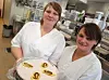 Elisabeth Larsen (t.v.) har bakt kaken som kjøkkensjef Linda Pedersen Vik viser stolt fram. (Foto: Odd H. Vanebo)