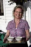 Liv Simble med den populære fiskesuppa som serveres i landhandelen. (Foto: Morten Holt)