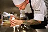 Christopher Davidsen med siste finpuss av hovedretten av kalv. (Foto: Morten Holt)