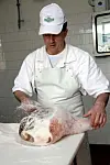 Skinkene blir massert inn med havsalt for hånd to ganger de tre første ukene av en saltmester – maistro salatore. (Foto: Helene Aarnes).