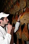 Før godkjenning kontrolleres skinkene ved hjelp av en nål av hestebein som stikkes inn i skinken og luktes på. Her demonstrert av Iacopo Rossi. (Foto: Helene Aarnes)
