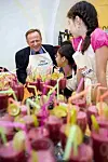 Lars Peder Brekk fikk servert smoothie av Melek Kilik og Hina Safdar. (Foto: Johnny Syversen)