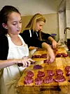 Ummahan Kilic og Aleksandra Pestka skjærer opp storfekjøttet. (Foto: Johnny Syversen)