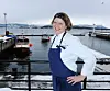 –Rett bak her henter vi blodfersk sjømat til restauranten, smiler kokk, Janne Kristin Småge. I bakgrunnen, til høyre, skimtes fyrlykta, som har gitt navn til hotellets pub. (Foto: Nils Erik Langva)