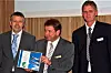 Svanelisens til Rica Airport HOtel: Fra venstre Arild Michelsen fra Rogaland fylkeskommune delte ut svanelisensen til adm.dir. ved Rica Airport Hotel, Magne Torgersen og hotellets tekniske sjef, Kjetil Ølberg.