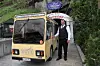 Portier Akaif Jakupi på Grandhotel Schönegg foran tunnelen til hotellet med den elektriske bilen til hotellet. (Foto: Morten Holt)