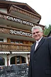 Hotelldirektør Konrad Metry utenfor Grandhotel Schönegg, som ligger høyt hevet over resten av Zermatt by. (Foto: Morten Holt)