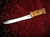 Knivspissen bærer preg av å ha vært brukket og oppslipt flere ganger etter ublide møter med gjenstridige skruer, eller knivkasting på blink på stabbursveggen. Anstrenger jeg meg kan faktisk høre for meg, den hurtige raspende lyden av fjerning av gjenstridige fiskeskjell på blodfersk uer, eller den rytmiske lyden av hvessing på stabburstrappa.