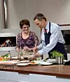 Fiskeriminister Lisbeth Berg-Hansen er begeistret for den norske nyvinningen EPS Box. Her lager hun sashimi av laks sammen med statsminister Jens Stoltenberg på God Morgen Norge tidligere i år. (Foto: Fiskeri- og kystdepartementet/Flikr)