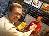 Hans Olav Hole får servert bestselgeren Ostepølse med bacon av driver Arnfinn Fagermo i Narvesen på Aker Brygge. (Foto: Odd Henrik Vanebo)