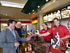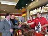 50% opp med 100% Veimat: Far og sønn Arne Kjell og Bjørn Kåre Knutsen, serverer kyllingburger til kjedesjef Hans-Petter Halmrast og salgskonsuletnt Reidar Dahlen i Nortura.