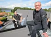 Richard Nilsson (fremst) på taket der solpanelet er installert. I Bakgrunnen Fredrik Karlsson fra Värmebaronen. (Foto: Lars Edling)