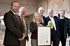 Glade prisvinnere: Fra venstre styreleder i Norsk Kulturarv Ivar Odnes, riksantikvar Jørn Holme, hotellsjef Tina Olsen, konsernsjef i OBOS Martin Mæland, administrerende direktør i Aspelin Ramm Peter Groth og fagrådsleder Jens Peter Ringstad i Norsk Kulturarv. (Foto: Espen Glee)