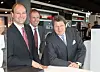 Den norske Miele-sjefen Dag Steenfeldt-Foss (i midten) er stolt av det nye signalbygget. Markus Miele (t.v.) og Reinhard Zinkann fra toppledelsen i det tyske familieselskapet, gleder seg over den gode markedsføringen mot E18. (Foto: Even Rise)