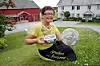 Astrid Olsen på tunet på Øvre Gangstad med prisbelønte Edel blå og Gangstad Gardsis. Bak til høyre hovedbygningen, bak til venstre gårdsysteriet. (Foto: Morten Holt)