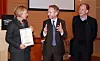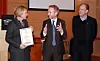 Hotelldirektør Trude Jacobsen, miljøvernminister Bård Vegard Solhjell og ordføreren i Lørenskog, Åge Tovan, under overrekkelsen. (Foto: Thon Hotels)