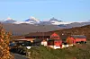 På godværsdager er det fantastisk utsikt fra Korgenfjellet Kro & motell mot Okstindane og Oksskolten (1917 moh.), Nord-Norges høyeste fjell.
