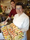 Kokk Kenneth Aune koker melkesuppe og assisterende kjøkkenleder Eli Skevik er ferdig med et av smørbrødfatene til dagens lunsj. (Foto: Odd Henrik Vanebo)