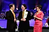 Programleder Arne Hjeltnes og fiskeri- og kystminister Lisbeth Berg-Hansen deler ut prisen for Årets Øl 2012 til Ægir India Pale Ale fra Ægir bryggeri i Flåm ved Evan Lewis. (Foto: Hanne Sirnes/Det Norske Måltid)