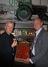 Konsernsjef i Avinor AS Dag Falk-Petersen (t.v.) og lufthavnsjef på Sola Leif A. Lorentzen smaker på godbiter fra Rogaland. (Foto: Odd Henrik Vanebo)