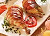 3. Løsne skinnet på lårene med fingrene og fordel smøret raust under skinnet. Pakk hvert lår inni to skiver bacon og legg dem i en ildfast form eller langpanne.