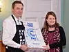 Frank Bakke-Jensen overrekker gaven til nestleder Evy Pilskog Stadsvik ved Aksept. (Foto: Svein-Erik Eide)