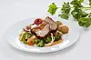 I juli serverer Utvalgte Spisesteder svinenakke med sommerens grønnsaker og bakte nypoteter. (Foto: Kim Holte)