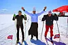 Direktør Atle Hovi i Beitostølen Resort, som er initiativtaker, og ordfører Kjell Berge Melbybråten i trikkeskinnene, samt AfterSki-bartender Tom Byfuglien (til venstre) fra Beitostølens hoffleverandør av AfterSki-opplevelser, Barcraft, og grillkokken fra Radisson Blu Beitostølen, Lukasz Czapczyk. I bakgrunnen skimtes Nautgardstind (2258 moh.) og Stornubben (2174 moh.) (Foto: Destinasjonskirurgene)
