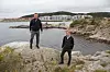 Gaute (til venstre) og Stig Ubostad fotografert før restaurant Under ble etablert i vika bak de to. I bakgrunnen Lindesnes Havhotell. (Foto: Morten Holt)