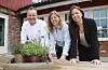 Kjøkkensjef Lars Erik Undrum, eier Stine Kirkeby og markedssjef Hege Kvervavik utenfor den ombygde låven på Asak Søndre i Sørum. (Foto: Morten Holt)