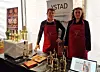 Søsknene Hallvard Ystad og Ingri Ystad Haakonsen på årets akevittfestival på Gjøvik. Den gamle kunstflasken sees ved siden av fiskebitene på disken. (Foto: Ystad børst og brennevin)