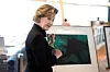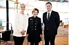 Dronning Sonja flankert av Hurtigrutens konsernsjef Daniel Skjeldam og Julie Ebbing, en av kunstnerne som gjennom samarbeidsavtalen mellom QSPA og Hurtigruten skal delta i utsmykkingen av MS Roald Amundsen. (Foto: Pontus Höök/Hurtigruten)