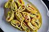 Pisk eggene og hell halvparten over i en varm panne (med sesamolje) slik at du lager en tynn pannekake. Strø over chili og vårløk og rull forsiktig sammen mens omeletten fremdeles er fuktig på toppen. Lag to slike pannekaker.