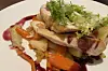 Lunsjbuffet i restauranten med lokale råvarer på tallerken og i glass.