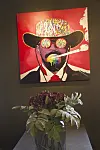 – Jeg liker å provosere litt med bildene mine, sier kunstner Mr. Kling, nærmere bestemt; Werner Kling.  Kunstnerens innholdsrike «Pop-art»-kunst vil pryde veggene i de nye lokalene til Bølgen & Moi Gimle de nærmeste månedene. (Foto: Bølgen & Moi)