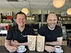 Svein Jæger Hansen (til venstre) sammen med Howar Johnsen fra Munin kaffebrenneri. (Foto: Jæger Hansens villmarkskaffe)