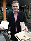 Jan-Erik Pavels Smith med noen av de miljøvennlige serveringsproduktene. (Foto: Morten Holt)