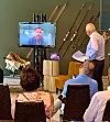Assisterende helsedirektør Espen Nakstad deltok live via Skype i den timelange dialogsamtalen på det nye Velkomstsenteret på Beitostølen, med programleder Bjørn B Jacobsen til høyre. (Foto: DestinasjonsKirurgene)