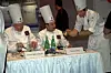 Rasmus Kofoed serverer juryen (Eyvind Hellstrøm til venstre) sausen under Bocuse d`Or Europe i Sveits i juni i år. (Foto: Heidi Fjelland)