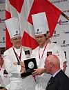 Rasmus Kofoed (til høyre) på podiet etter at han vant Bocuse d`Or Europe 2010 i Sveits. (Foto: Morten Holt)