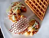 Sprø vaffel, rabarbra fra Ullandhaug, brunost og rømme