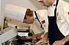 Ørjan Johannessen (til høyre) og Geir Skeie i aksjon under Bocuse d'Or Europe i Stavanger, som Skeie vant med god assistanse av commis Johannessen. (Foto: Morten Holt)