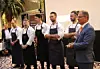 Deltakerne sammen med Arne Sørvig (daglig leder i Stiftelsen Bocuse d'Or Norge under kjøkkentrekningen for en drøy uke siden. (Foto: Morten Holt)
